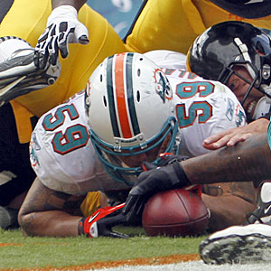 The third-down play, coming from the Miami 2 with 2:37 left, was initially called a touchdown, but after a booth review it was ruled a fumble. Since it wasn't apparent who recovered the football the ruling was a fumble but still Steelers ball. Jeff Reed then trotted out and made an 18-yard field goal for the winning points.