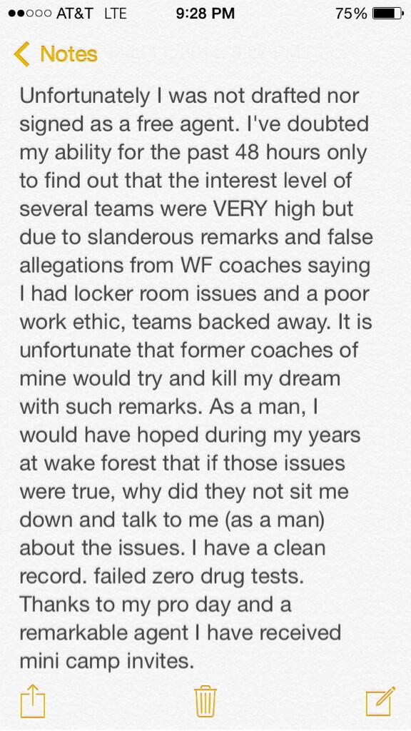 Perhaps it wasn't Lobotzke, but Harris claims again scouts told him he was "badmouthed" by Wake Forest coaches, likely being a reason he wasn't selected. Harris tried out with the Cowboys at their rookie minicamp, but an injury during that likely ended hopes of signing there.