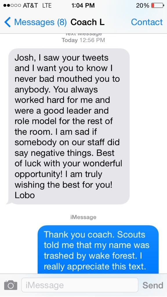 Later, Harris would be contacted by Wake Forest offensive coordinator Steed Lobotzke, who told him via text he told NFL teams he vouched for his character. Lobotzke is now the offensive coordinator at Winston Salem State.