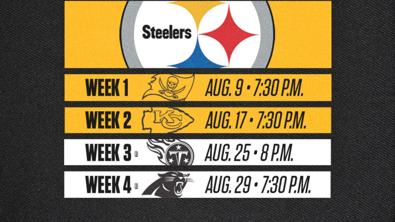 The Steelers kick off the preseason at Heinz Field in a Week 1 matchup against the Tampa Bay Buccaneers on Friday, Aug. 9 at 7:30 p.m. The game will be televised on KDKA-TV.
