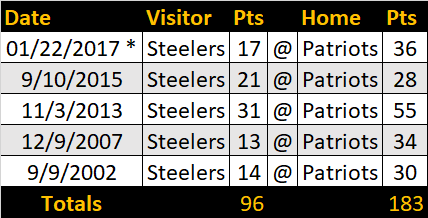 Steelers last 5 game results against the Patriots* with Tom Brady at QB on the road: