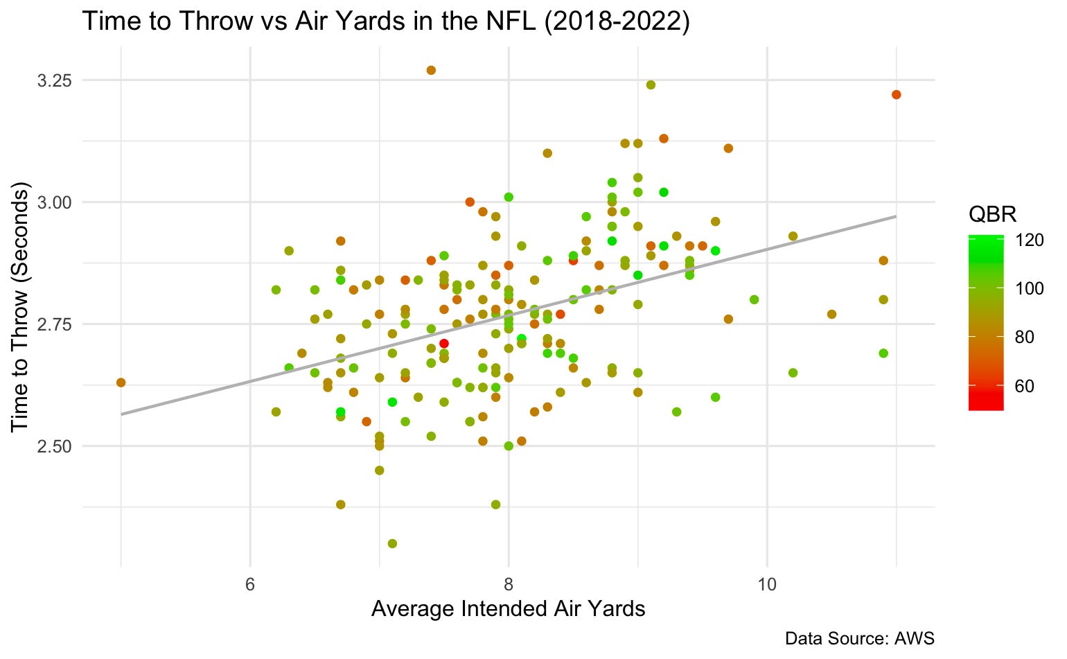 This author did a statistical analysis on Next gen stats data to determine if there is a relationship between the highest rated QBs and the time to throw. The dataset is from 2018-2022 time frame for all QBs that played a minimum of number of games.