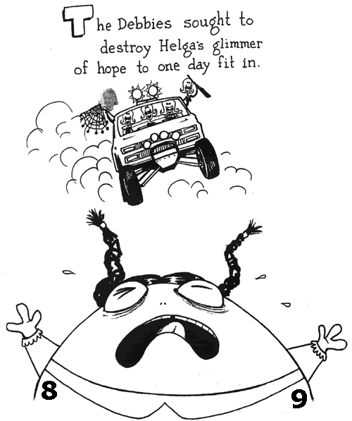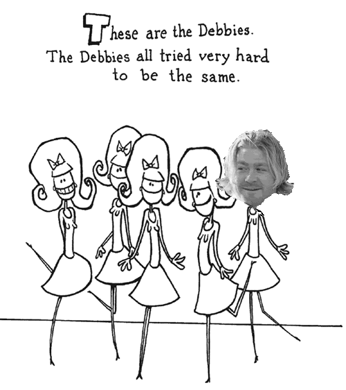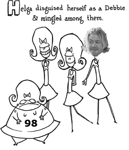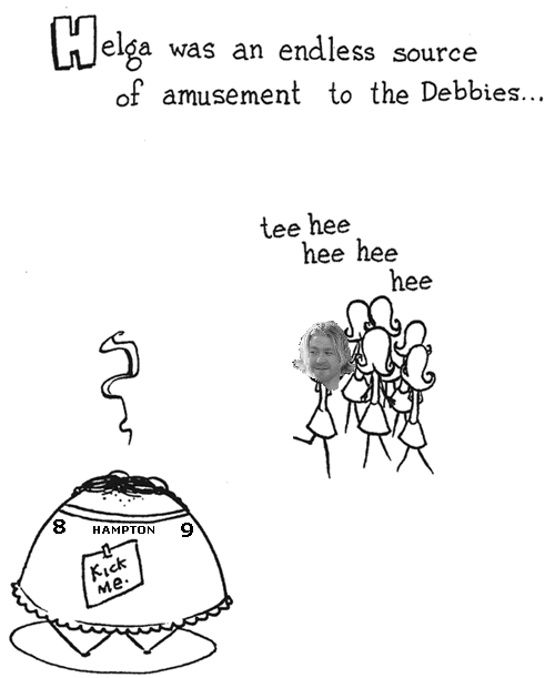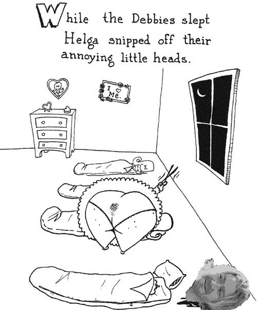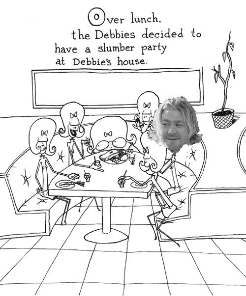 ...the first that I thought was he was trying to be one of the Debbies with that haircut. Since I was somewhat certain that one of my favorite picture books of all time, "Creepie Susie" by Angus Oblong was a fairly obscure reference within a Steeler message board crowd, I wasn't going to do anything, since very few if any would actually get the joke. (By the way, this book is definitely not for children or any polically correct schmoe that would be easily offended by tasteless humor that makes fun of physical deformities, since it contains stories like "Jenny, Jenny, Jenny & Babette: the Siamese Quadruplets," "Mary Had a Little Chainsaw," "Narcoleptic Scotty," and "Emily Amputee"). Perhaps a few of you have heard of it before, since there was a short-run "Oblongs" series on Cartoon Network a few years ago (with Will Ferrell as one of the voices). Anyway, since there was also an obvious target for Helga right now, without further ado, I bring you the first ever crudely Photoshopped story...my version of "The Debbies." Enjoy, enjoy!!!