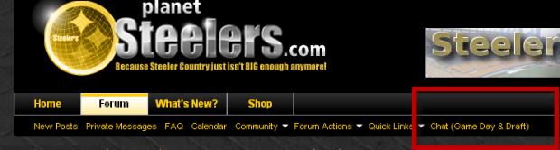 If you already have a Planet Steelers Forum account, all you need to do is log into the forum, and click the ‘Chat’ link (see the picture below):